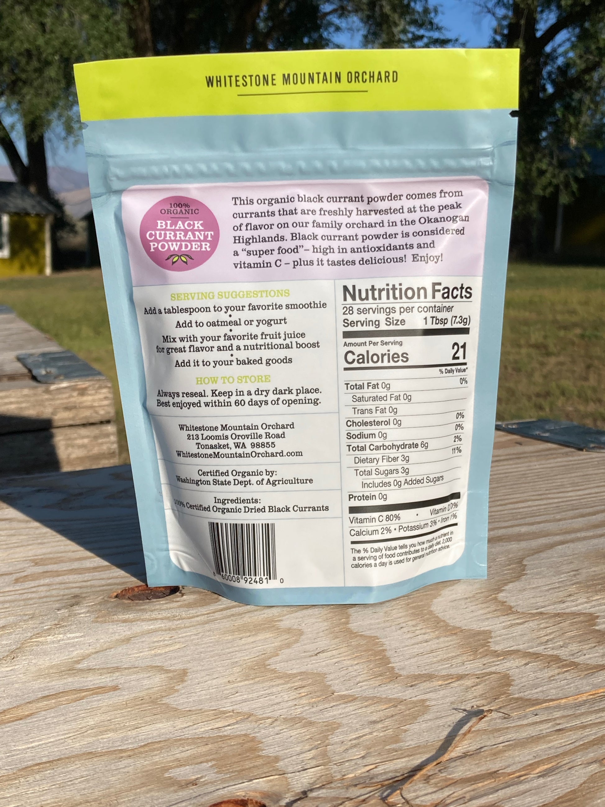 This 100% organic black currant powder comes from our berries, freshly harvested by hand at the peak of flavor. Truly a “super food”, this powder has 2x more antioxidants than blueberries and 4x the amount of vitamin C found in oranges. No additives. Wonderful to add to smoothies, yogurt, or oatmeal, or mix with your favorite fruit juice for a nutritional boost and great flavor. Powder comes in a 7.2 oz pouch.